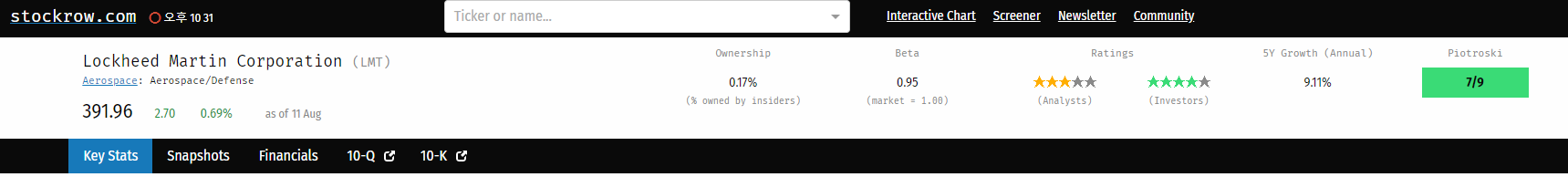 사실 미국 시장의 경우 워낙 좋은 주식 분석 사이트들이 많기 때문에 Piotroski score를 직접 구하지 않더라도 여러 사이트에서 쉽게 값을 찾아볼 수 있다. 대표적으로 stockrow.com에서 기업을 검색하면 맨 위에 다음과 같은 상단바가 보이는데, 가장 오른쪽 네모박스에 Piotroski 라고 써 있고, 9점 중 몇 점을 받았는지 적혀있다.