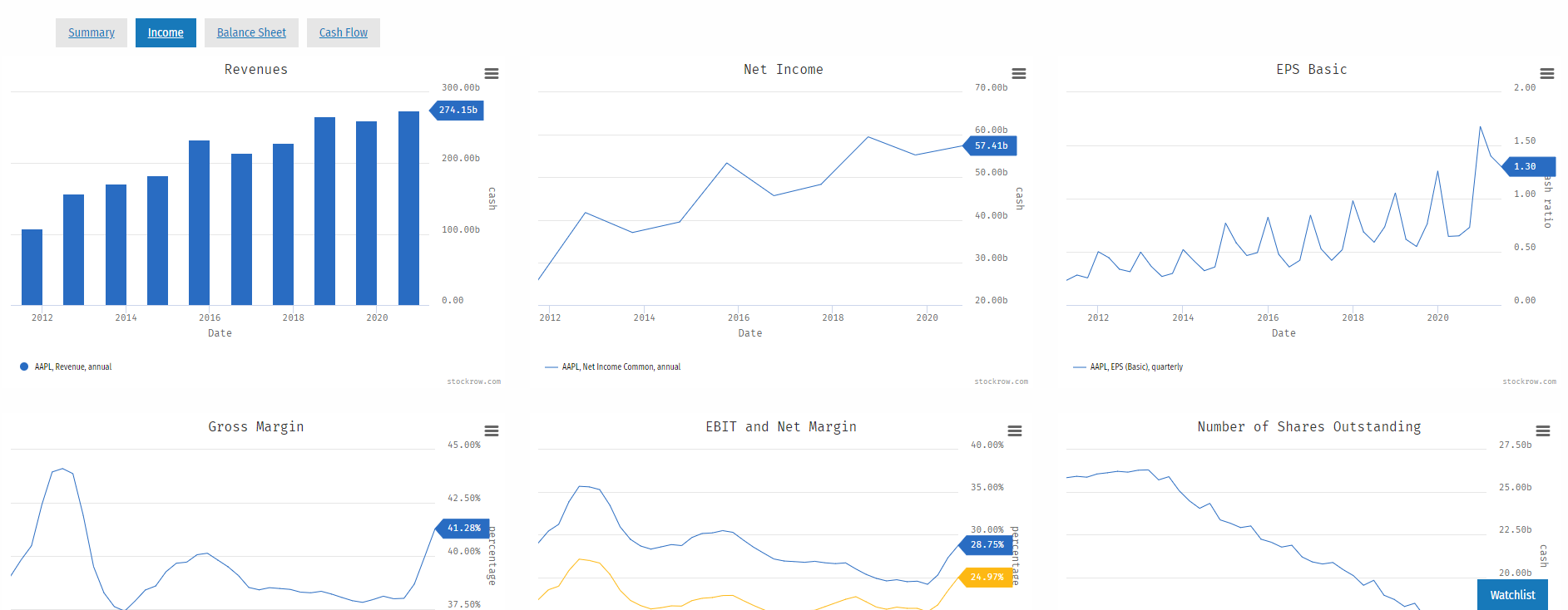 첫 페이지가 끝이라 생각하면 큰 오산! Stockrow에는 아래 스크린샷처럼 재무제표 데이터를 분석하기 위한 다양한 그래프가 있습니다. 이 역시 과거 10년까지의 데이터를 다뤄주기 때문에, 기업 트렌드 분석을 할 때 상당히 유용합니다.