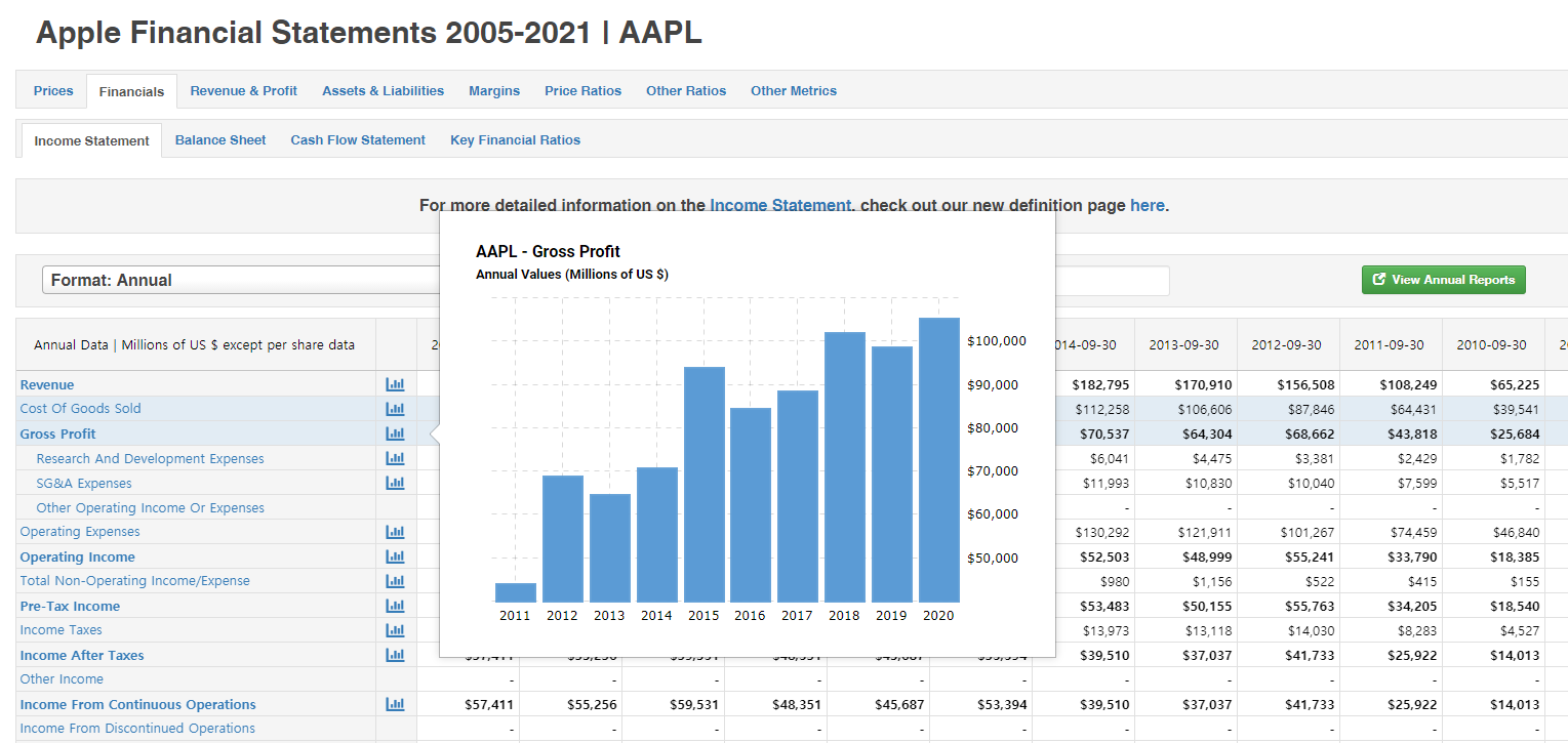 앞서 Stockrow 설명에서 언급하진 않았지만, Stockrow와 Macrotrends 모두 아래 스크린샷과 같이 재무제표 각 항목(ex: Revenue, Gross profit, Income 등)의 연간/분기별 변화 추이 역시 확인할 수 있습니다. 각 항목 글씨 오른쪽에 차트 모양 아이콘이 있는데, 여기 마우스를 갖다대면 과거 10년간의 변화 추이가 시각화되어 나타납니다.