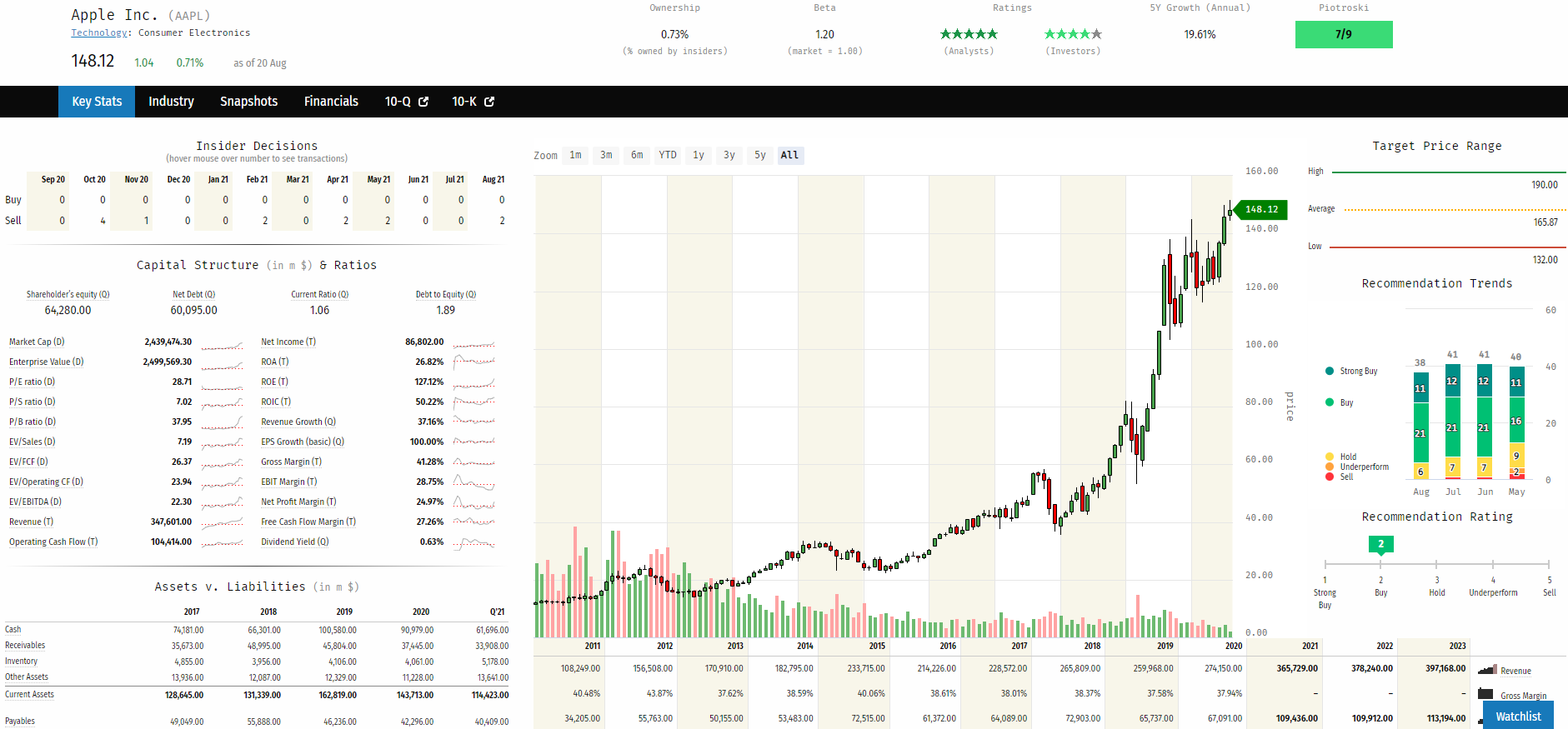 또한, 재무제표 뿐 아니라 PER, ROE 등 재무와 관련된 여러 지표들을 함께 볼 수도 있고, 애널리스트 추천, 목표가 등 증권사의 의견, 내부자 거래까지도 정리되어 있습니다. 이러한 정보들을 과거 10년 전 데이터까지 제공해주기 때문에, 장기적인 관점에서 기업 분석을 하기에는 가장 유용한 사이트가 아닌가 싶습니다.