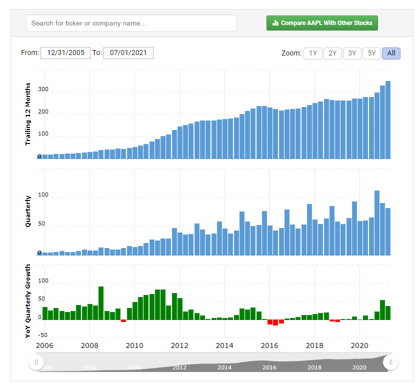 사실 이정도 데이터는 Stockrow에서도 제공해 줍니다. 그럼에도 Macrotrends를 소개해드리는 이유는, 이 사이트가 Stockrow에 비해 더 긴 기간의 데이터셋을 보유하고 있기 때문입니다(AAPL 기준 Stockrow : 10년, Macrotrends: 15년).