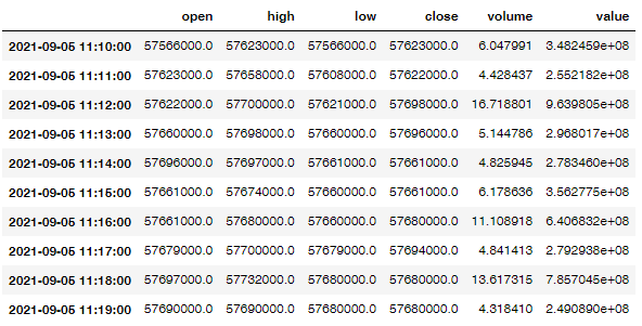 입니다. 즉, 위 코드를 해석하자면 비트코인의 21.09.05 11시 20분 전 10개의 1분봉 데이터를 받아오겠다는 의미입니다.
