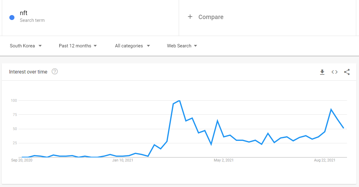 그 중 올해 NFT의 열기는 상상초월이었는데요, 아래 Google Trends에서 NFT라는 키워드가 얼마나 많이 검색되었는지를 나타낸 그래프를 보시죠. 올해 2월부터 조금씩 'NFT' 검색량이 늘더니, 3, 4월에 최고점을 찍었습니다. 이후 검색량이 줄어들었다가 8월부터 다시 검색이 늘고 있는 상황입니다.