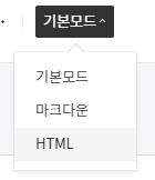 연결 방법은 간단한데요, 글쓰기 창에 들어가시면 상단 메뉴 오른쪽에 아래 스크린샷처럼 드롭다운 메뉴가 하나 있습니다. 여기서 HTML을 클릭해주세요.