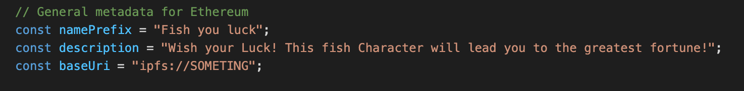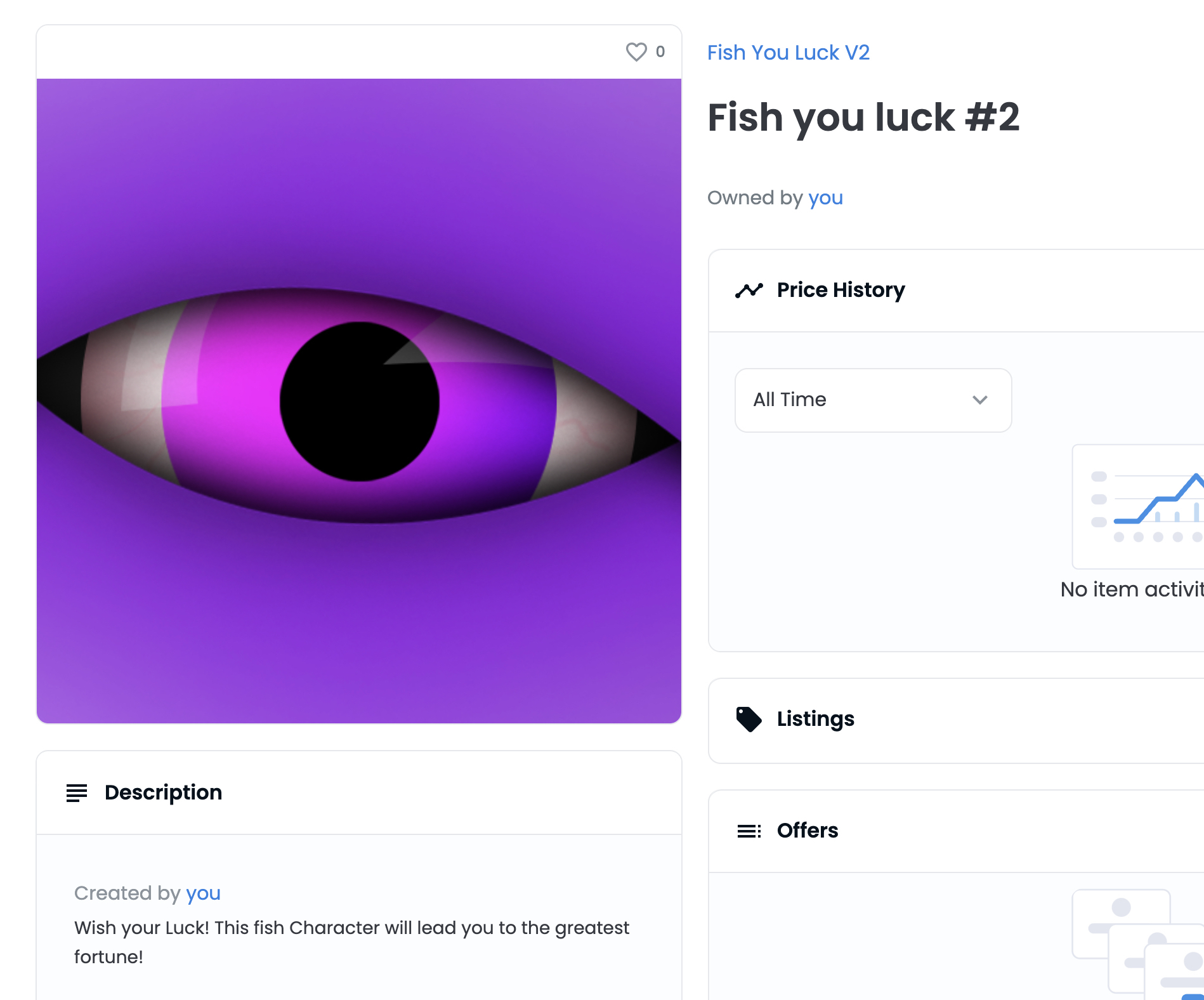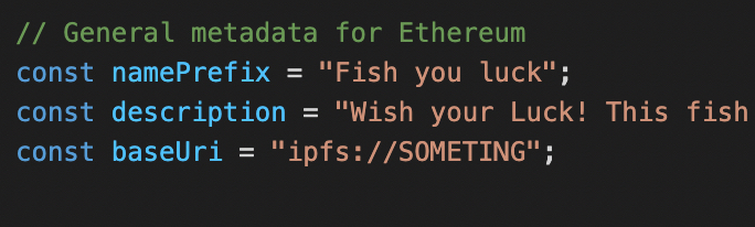 설명을 돕기 위해 결과물을 미리 보여드리자면, 아래 그림처럼 namePrefix에 적은 Fish you luck이 NFT의 이름으로(검은색 굵은 글씨) 들어가고(맨 위 파란색 글씨는 메타데이터가 아닌 NFT 자체의 이름이므로, solidity에서 설정해야 하는 부분입니다),