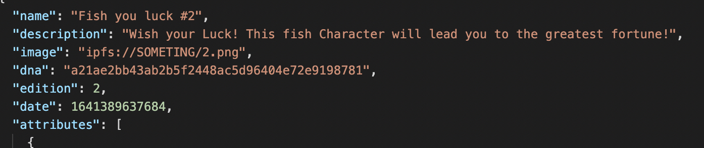 build/json 폴더에 있는 json 파일을 아무거나 하나 확인하면, image 란이 아래처럼 ipfs://~~~~/2.png로 되어있을텐데요(화면처럼 'SOMETHING'이라 써있지 않아도 무관합니다),