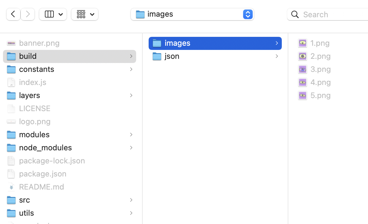 또한, build라는 폴더가 생성되었을텐데요, 이 폴더 안에 여러 레이어 소스들을 조합해서 만든 이미지 5개, 그리고 각 이미지에 부합하는 json 파일 5개가 생성되어 있을 겁니다.