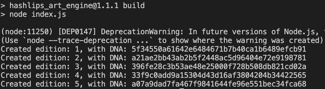 터미널에서 hashlips_art_engine 폴더로 이동한 다음, 아래 코드를 돌려주세요.