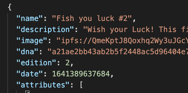 설명을 돕기 위해 결과물을 미리 보여드리자면, 아래 그림처럼 namePrefix에 적은 Fish you luck이 NFT의 이름으로(검은색 굵은 글씨) 들어가고(맨 위 파란색 글씨는 메타데이터가 아닌 NFT 자체의 이름이므로, solidity에서 설정해야 하는 부분입니다),