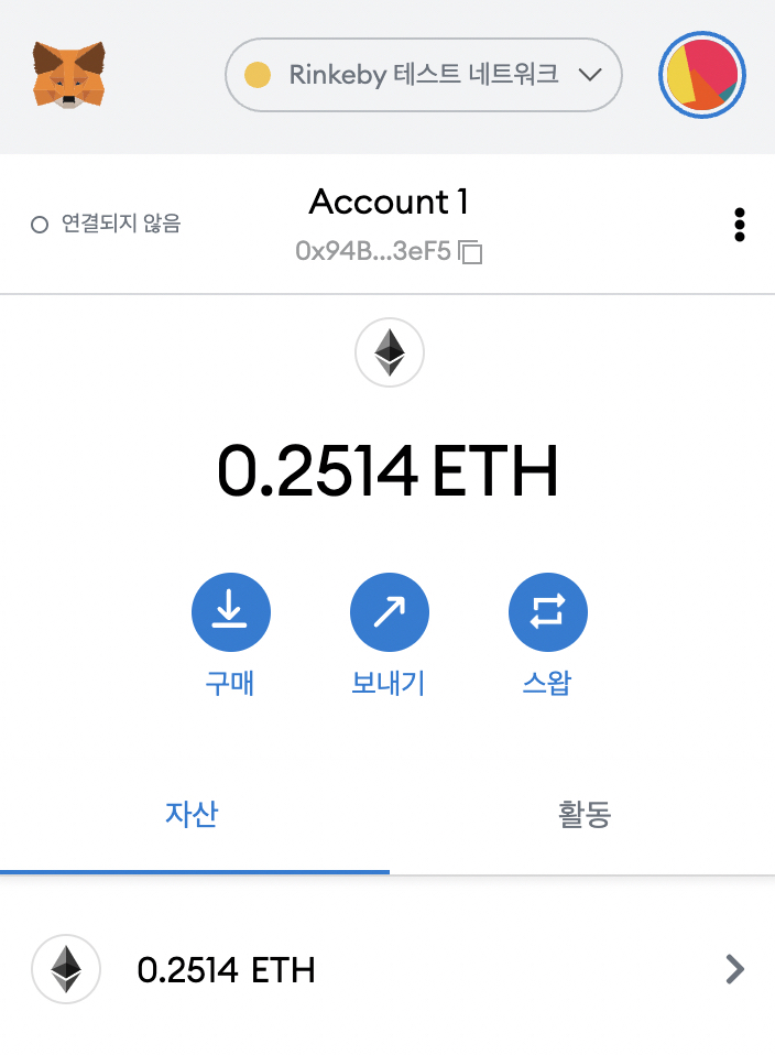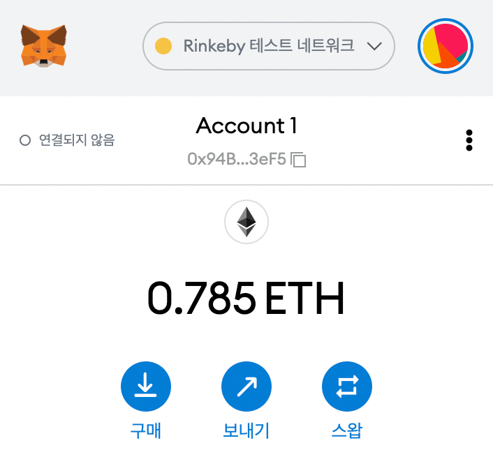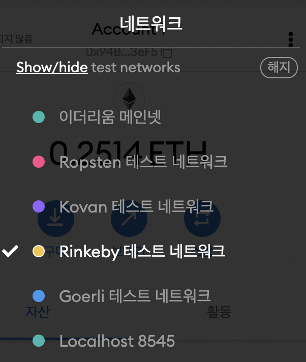 Metamask를 켜면 아래처럼 내 계좌가 뜨는데요, 맨 위에 'Rinkeby 테스트 네트워크'라고 뜨는게 보이시나요?