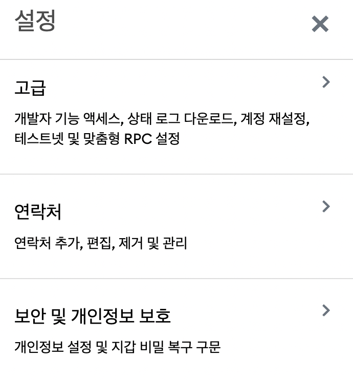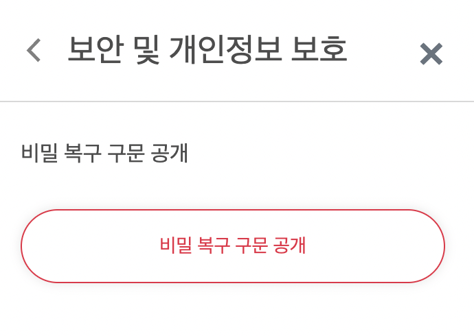 | 오른쪽 위 내 프로필(동그란 모양) 클릭 | 설정 클릭 | 보안 및 개인정보 보호 클릭 | 비밀 복구 구문 공개 클릭 |