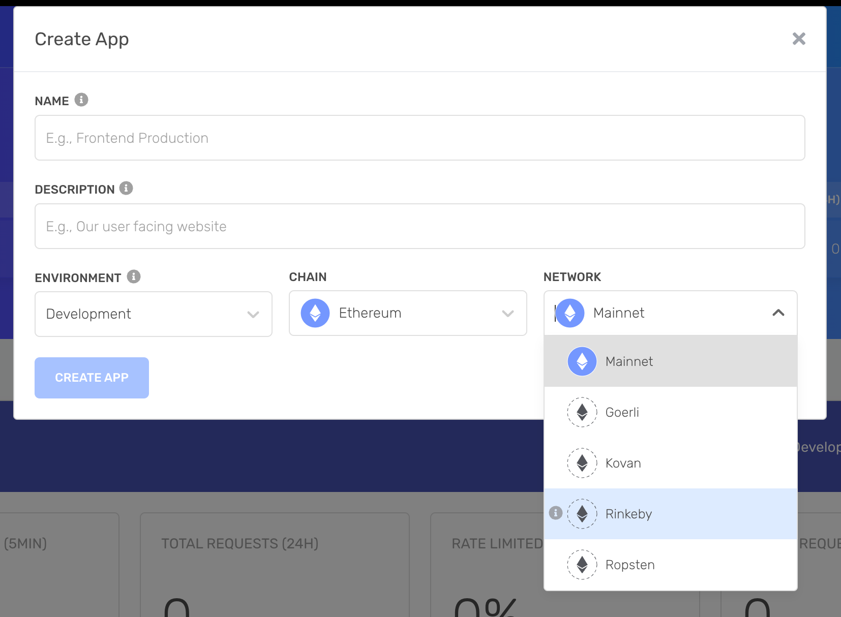 Alchemy에 가입 후, 홈 화면에서 'Create App' 버튼을 찾아서 클릭해주세요. 그 다음은 아래 스크린샷처럼 Network 에서 Rinkeby를 찾아서 입력하고, Create App 버튼으로 생성을 완료합니다.