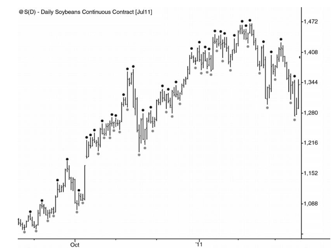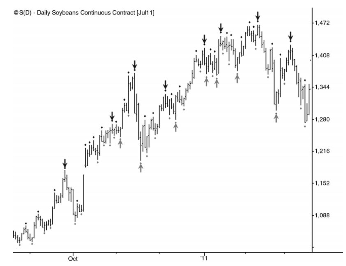 설명을 돕기 위해, 책에서 예시 하나를 발췌해 왔습니다. 위 차트에서 진한 동그라미가 Pivot High, 연한 동그라미가 Pivot Low입니다. 어제/내일 고가보다 오늘 고가가 높다면 Pivot High, 저가보다 오늘 저가가 낮다면 Pivot Low라는 것이 이해가 되시나요?