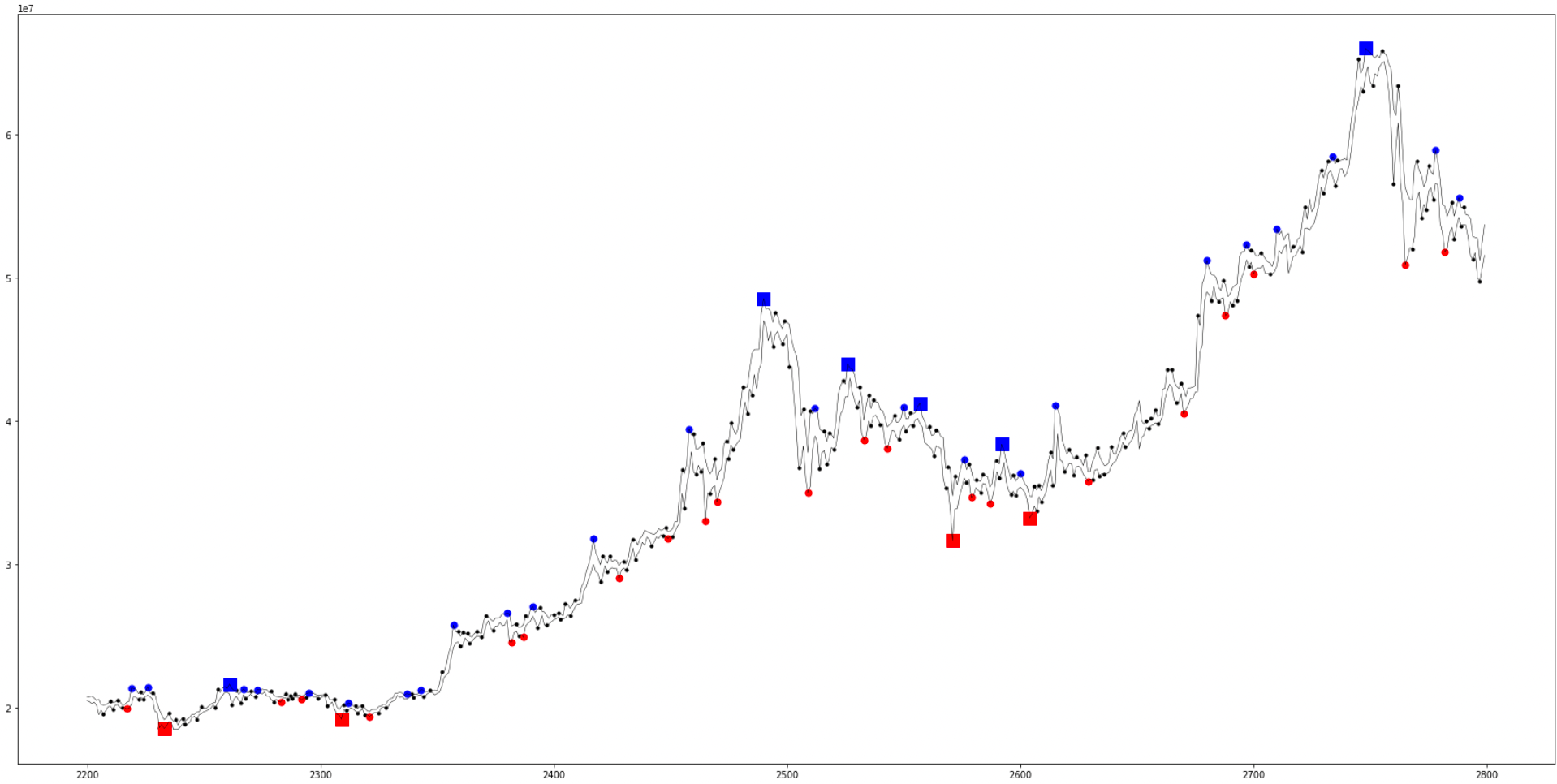 pivot_high_order2 = np.array([1 if past_diff[i] > 0 and past_diff[i] * future_diff[i] > 0 else 0 for i in range(len(past_diff))])