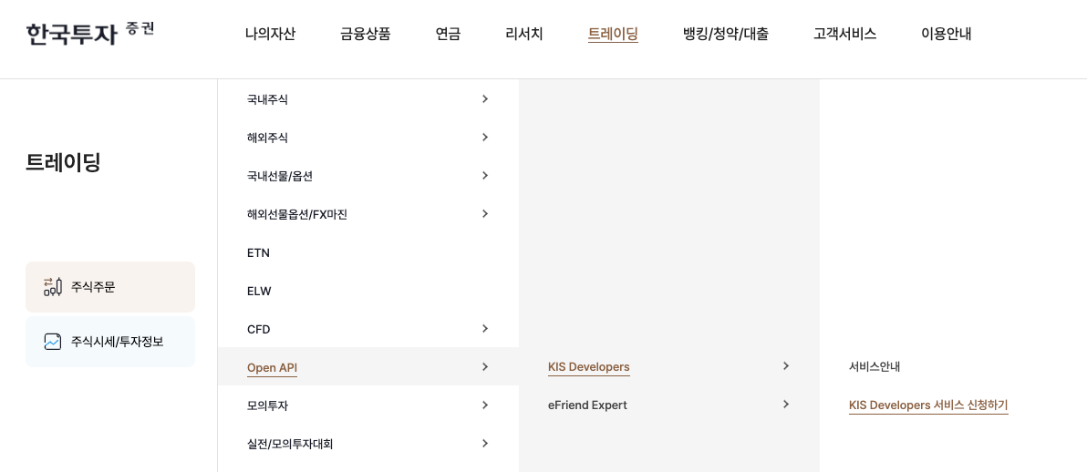 한국투자증권 홈페이지에 접속해, 아래 사진처럼 "트레이딩 - Open API - KIS Developers - KIS Developers 서비스 신청하기" 메뉴에 들어갑니다.