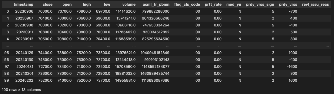 temp = temp.rename(columns={'stck_bsop_date':'timestamp','stck_clpr':'close','stck_oprc':'open','stck_hgpr':'high','stck_lwpr':'low','acml_vol':'volume'})