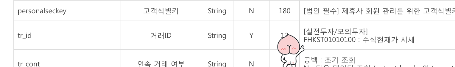 이렇게 tr_id값을 찾았다면, 그 외 필요한 값은 간단합니다. api_key, secret_key는 증권사에서 발급받은 키를 입력하구요, access_token은 앞선 포스팅에서 발급받은 토큰을 입력합니다.