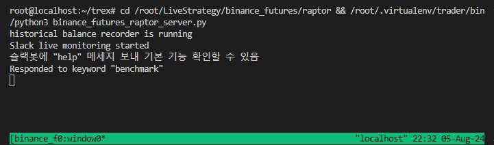 3. crontab에 등록한 실행시간이 됐다면, 쉘 스크립트가 돌아가면서 tmux가 실행되었습니다. tmux a를 통해 tmux에 접속하고, 내 전략이 제대로 돌아가는지 모니터링합니다.