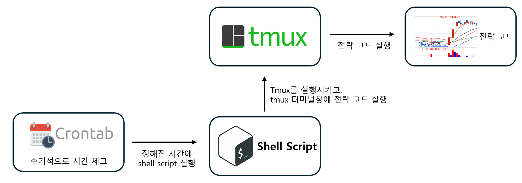 Crontab + Shell Script + Tmux를 활용해 주기적으로 전략을 재실행해주는 프로세스를 작성해 보았습니다.