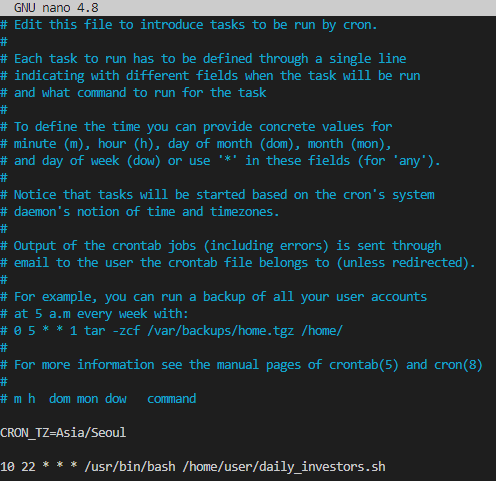 간단히 살펴보면, 매일 밤 10시 10분에 /usr/bin/bash /home/user/daily_investors.sh 코드를 터미널에서 실행하라는 의미를 가지고 있네요.