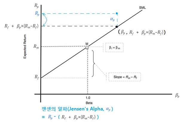 Jensen’s alpha는 SML위에서 어떤 포트폴리오의 수익률을 A, 그리고 동일한 Beta값에서 SML위의 값의 수익률을 B라고 한다면, Jensen’s alpha(a) = A - B라고 할 수 있다. 이 a 값이 양수면 같은 체계적위험 하에서 더 높은 수익률을 가진다고 해석할 수 있다. 이를 통해 Jensen’s ratio를 펀드의 평가 지표로서 활용할 수 있다.